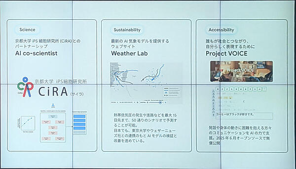 同社は「AIの力で解き放つ、日本の可能性」というビジョンのもと、再生医療を支援する「AIサイエンティスト」の開発や、最大15日先を予測する「台風予測モデル」、ALS患者の会話を支援するアクセシビリティ技術のオープンソース化など、日本固有の課題解決に向けた取り組みを加速させている。