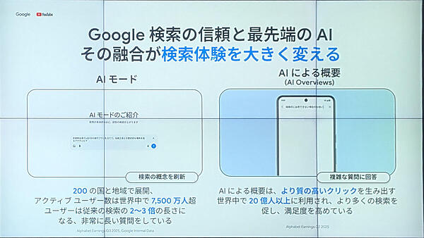 「AI Overviews(AI による概要)」と「AIモード」の導入により、従来は回答が困難だった「食前にハイカカオチョコを食べる効果と理由」といった、複数の要素が絡み合う複雑な質問にも、簡潔かつ的確な回答を提示できるようになった。これにより、検索の利用頻度はかつてないスピードで拡大しているという。