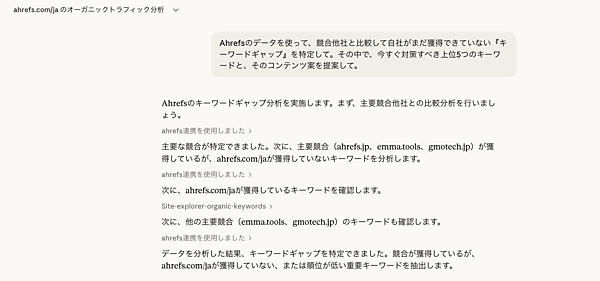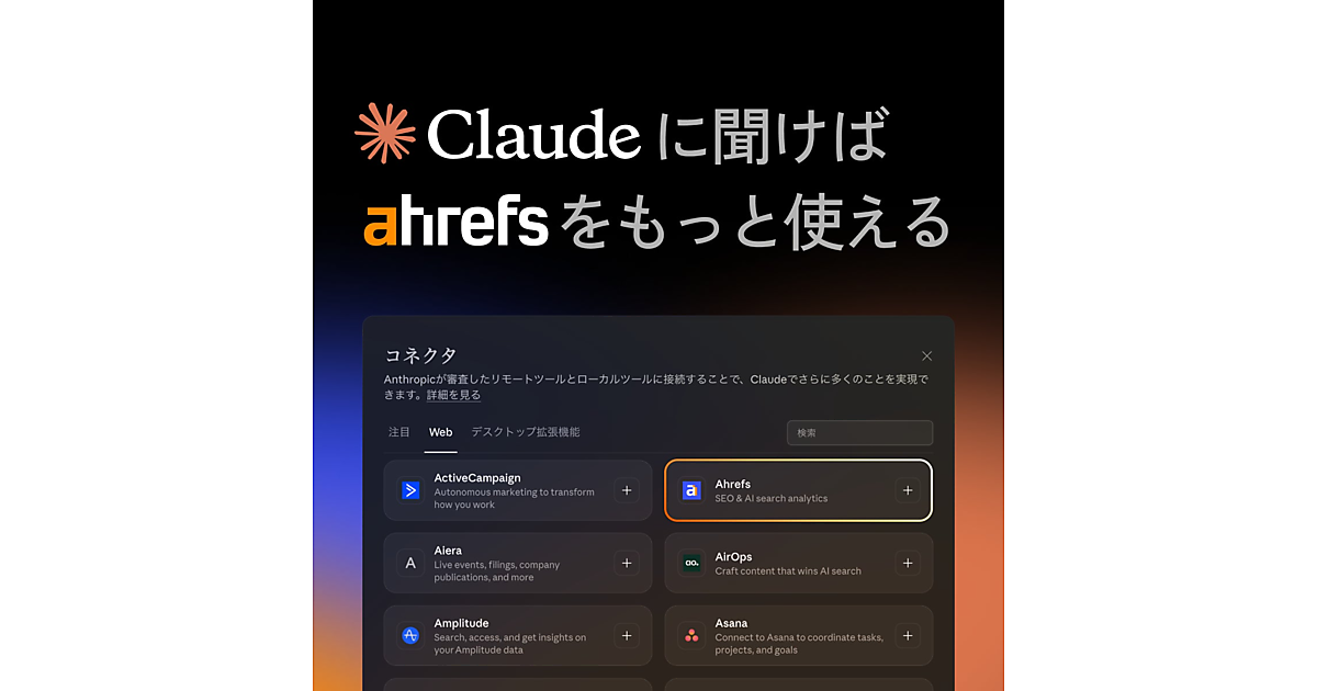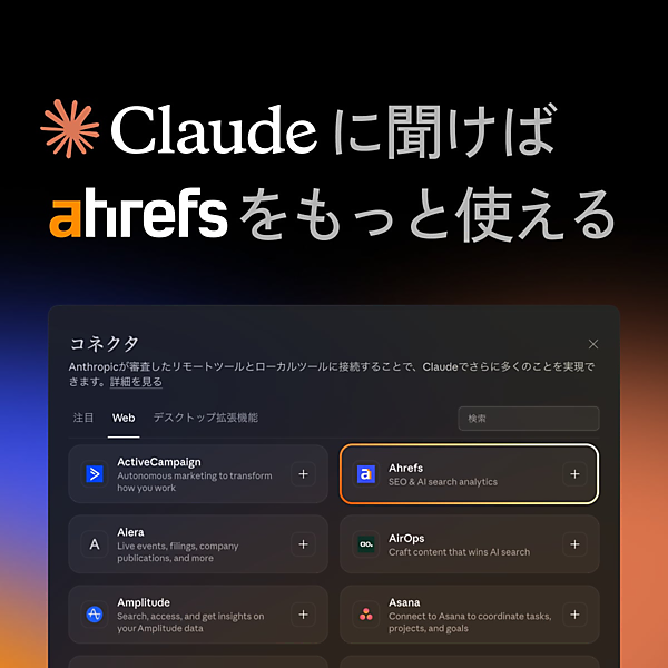AhrefsがClaudeのコネクタ機能に対応。AI検索時代のブランド監視とSEO分析の自動化が生成AIとの対話で可能になる。Ahrefsの膨大なデータをClaudeが直接参照し、複雑な指標を、今何をするべきかという具体的なアクションプランに変換する。ファイルのエクスポートやアップロードの必要はなく、Claudeに自然言語で話しかけるだけでAhrefsのインデックスから情報をリアルタイムに抽出・分析する。