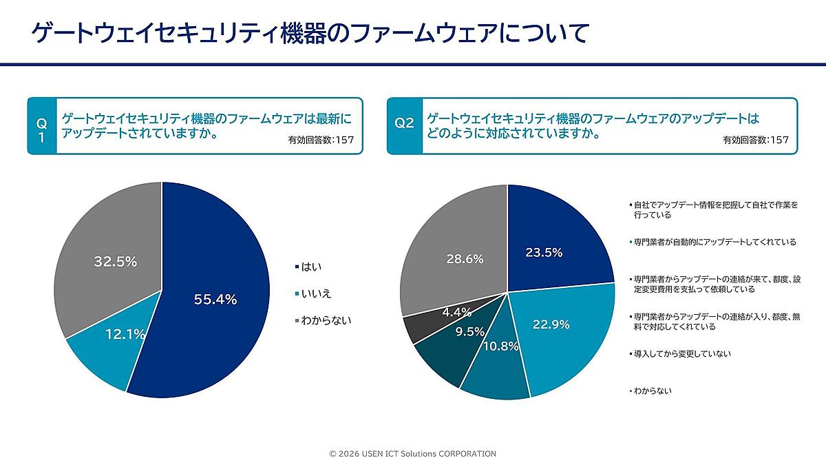 次に「ゲートウェイセキュリティ機器のファームウェアは、最新にアップデートされていますか」と聞くと、「はい」は55.4%だが、残りの44.6%は「いいえ(最新にアップデートしていない)・わからない」と回答している。さらに「どのように対応していますか」と聞くと、専門業者に任せきりで状況を把握していない・できていない傾向もかいまみえる。