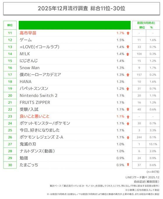 そのほか上位には「Mrs. GREEN APPLE」「チェンソーマン」「麻辣湯(マーラータン)」などがランクイン。コンテンツ以外では10位に「インフルエンザ」が、11位に「高市早苗」がランクインしている。