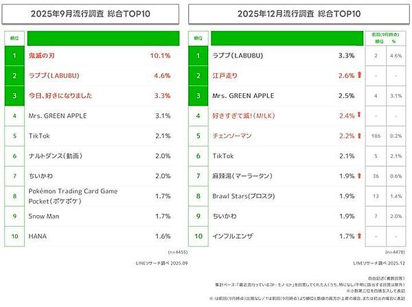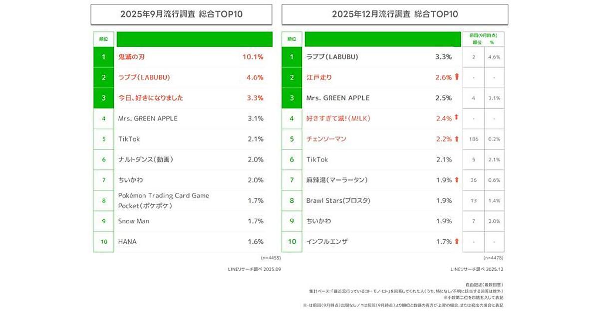 最新12月期のランキングを見ると、「ラブブ(LABUBU)」が前回(9月期)の2位から順位を上げ、1位となった。2位には膝痛を克服するための走り方を研究する大場克則氏が考案・提唱した走法「江戸走り」が初めてのランクイン。TikTokなどでも江戸走りに挑戦する動画がアップロードされるなど人気となった。4位にはボーカルダンスユニットM!LKの楽曲「好きすぎて滅!」が初登場している。