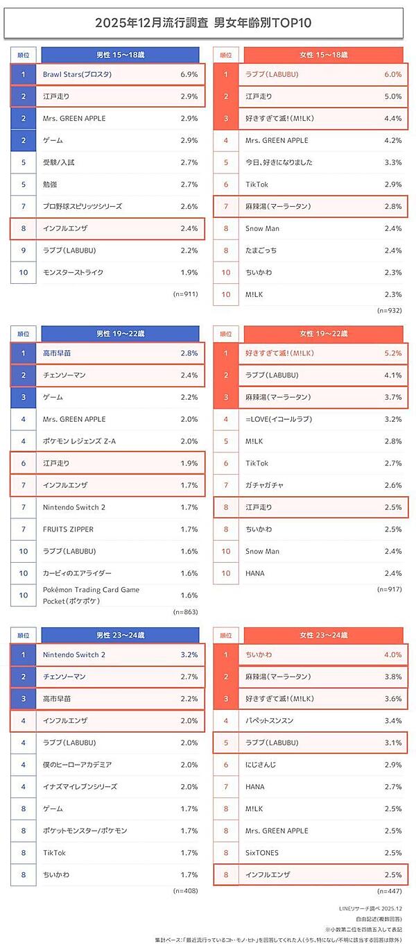 男女年齢別で結果を見ると、1位がすべて違っている点が特徴。男性15~18歳では、「Brawl Stars(ブロスタ)」(総合8位)、男性19~22歳では「高市早苗」(総合11位)、男性23~24歳では「Nintendo Switch 2」(総合20位)がそれぞれ1位だった。一方、女性15~18歳では「ラブブ(LABUBU)」(総合1位)、女性19~22歳では「好きすぎて滅!」(総合4位)、女性23~24歳では「ちいかわ」(総合9位)がそれぞれ1位だった。特に総合4位の「好きすぎて滅!」は、女性のすべての年齢層で3位までにランクインしている。