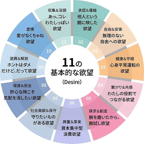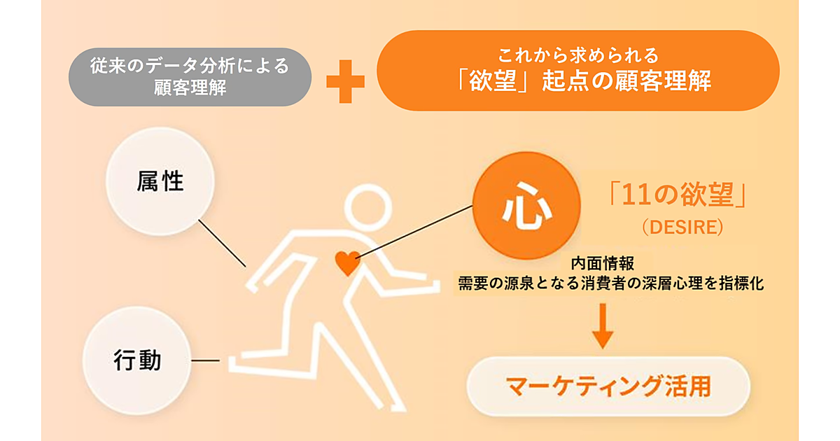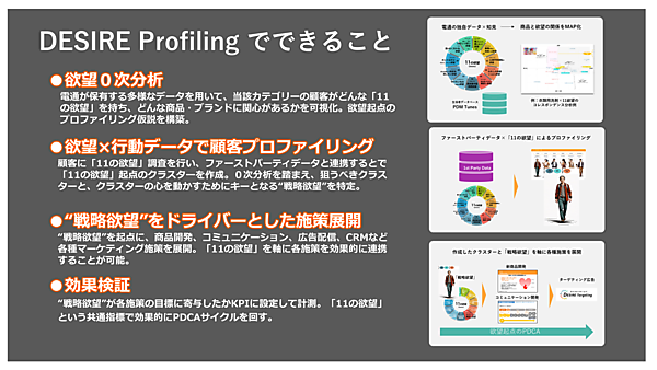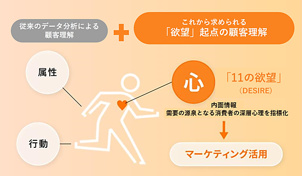 DESIRE Profilingは、企業が自ら収集したデータのファーストパーティデータに、11の欲望を取り入れ、11の欲望を起点に顧客データを統合・分析してマーケティング施策に活用する仕組み。11の欲望は、人を消費行動に駆り立てる感情を可視化した指標で、商材の需要の基になる深層心理を「見える化」した。