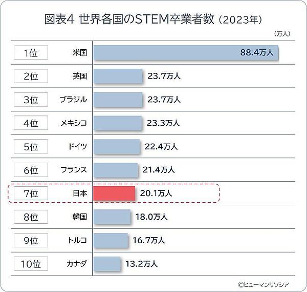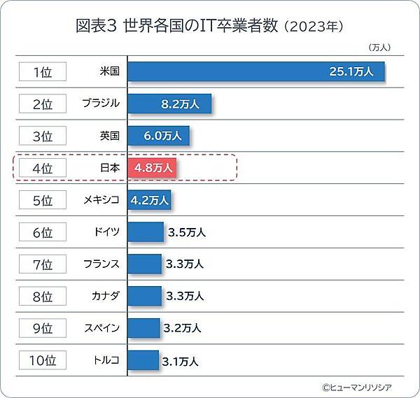 国別にIT/STEM分野の卒業者数を見ると、いずれも米国がトップで、IT分野で25.1万人、STEMで88.4万人を輩出。日本は、IT分野の卒業者数は4.8万人で42カ国中4位、STEM分野の卒業者数は20.1万人で7位だった。なお出典・年度が異なるため参考となるが、現在のITエンジニア数の世界1位はインドで、IT分野の卒業者数は年55.9万人と、米国の倍以上に上る。