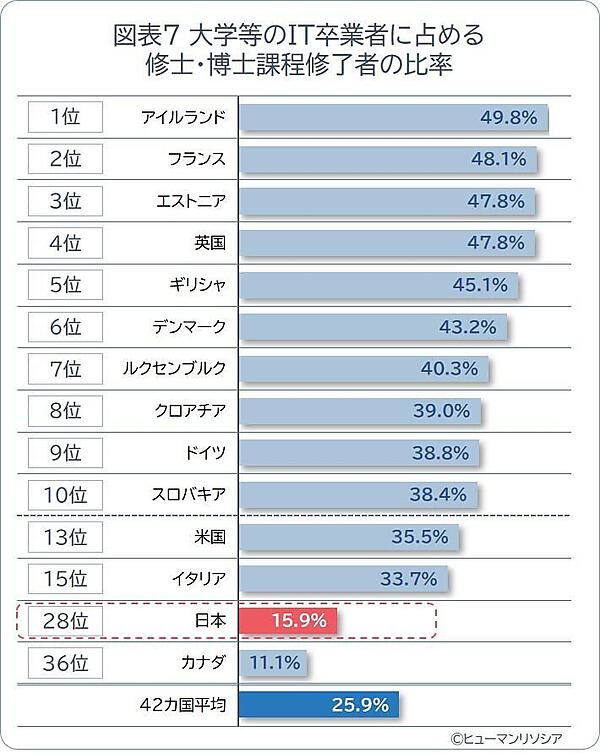 なお「大学等のIT卒業者に占める大学院(修士・博士課程)修了者」の割合は、調査42カ国の平均は25.9%。アイルランドが49.8%、フランスが48.1%、エストニアが47.8%など、上位国では半数近くを大学院卒業者が占めた一方、日本は15.9%で平均を大きく下回っており、42カ国中28位だった。