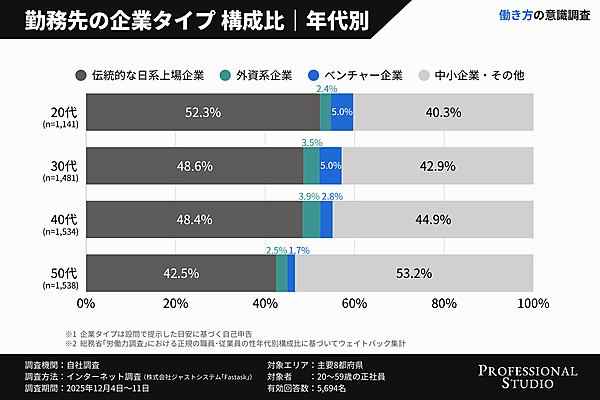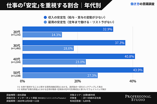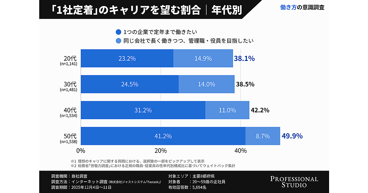 Professional Studioは、Z世代の仕事観や働き方に関する調査を実施した。理想のキャリア像や仕事で重視することなどについて、20歳~59歳の正社員5,694名を対象に調査し、年代別に分析している。