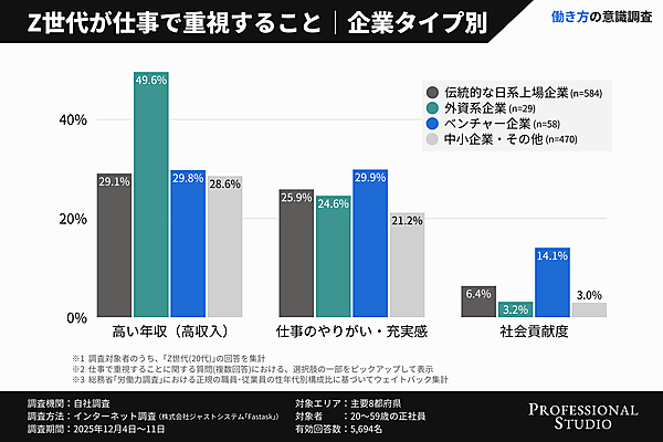 続いて、Z世代に対し、仕事で重視することを企業タイプ別で聞くと、「高い年収」は外資系企業社員が49.6%と突出して高く、「仕事のやりがい・充実感」はベンチャー企業社員が29.9%で最多となった。また、ベンチャー企業社員は「社会貢献度」に対する意識も高く、金銭的な条件よりもやりがいや手ごたえを求めていることがわかった。