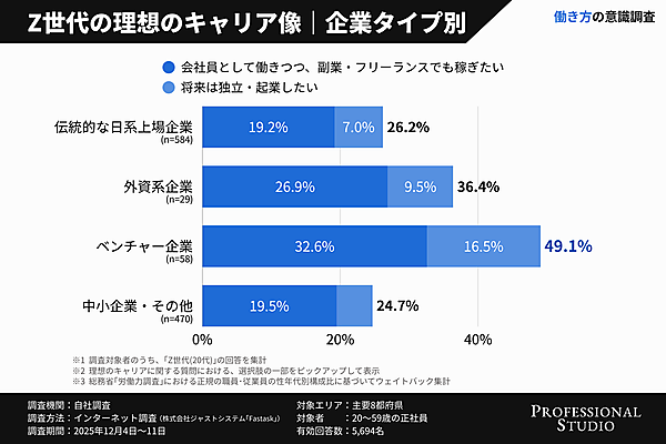 Z世代の今後のキャリア像について企業タイプ別に見ると、「会社員として働きつつ、副業・フリーランスでも稼ぎたい」と「将来は独立・起業したい」を合計した割合はベンチャー企業社員では49.1%となり、伝統的な日系上場企業社員の約1.9倍にのぼった。