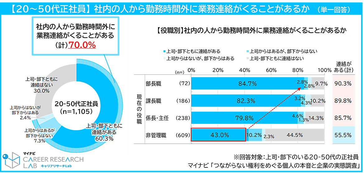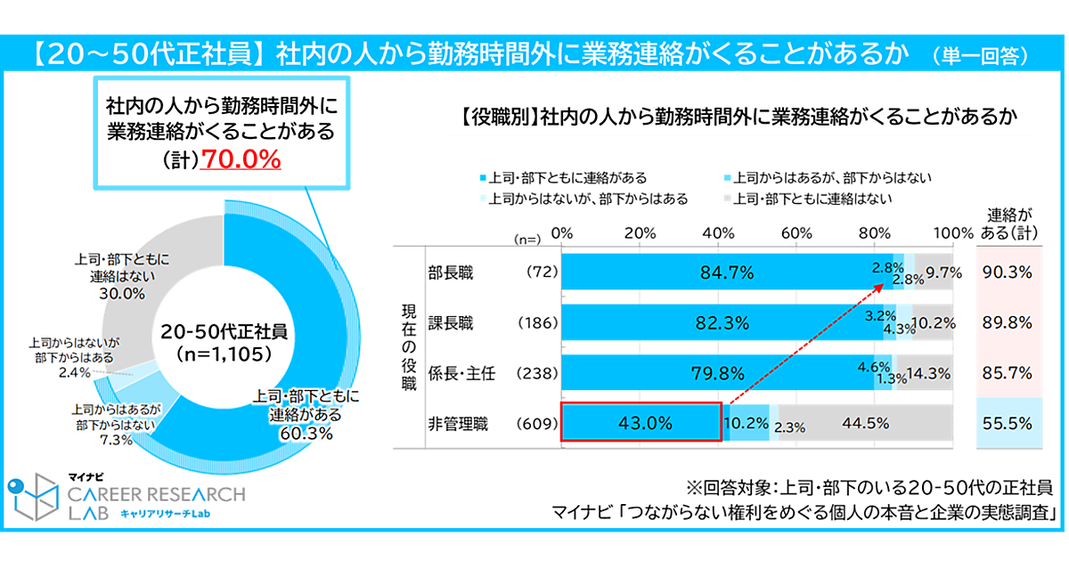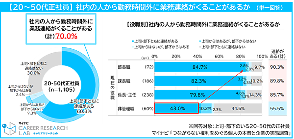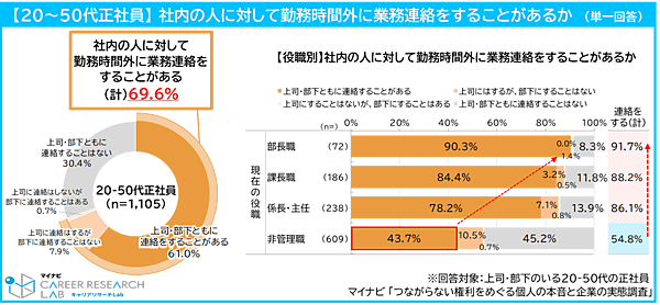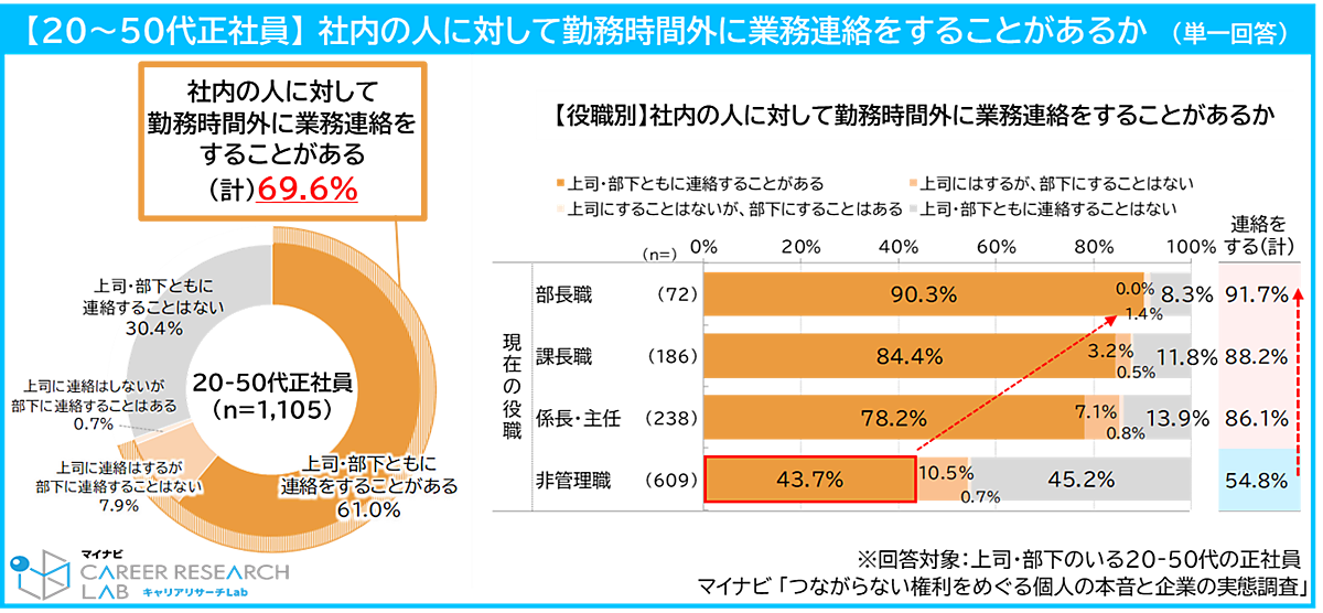 また、勤務時間外に業務連絡を“する”ことはあるかという質問では、全体で69.6%が「ある」と回答。役職別では部長職が90.3%で最も高く、非管理職では43.7%で最も低い結果となった。