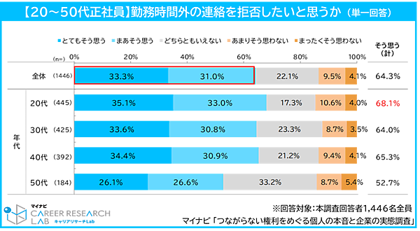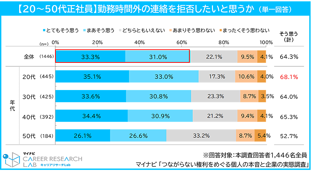 勤務時間外の業務連絡を拒否したいと思うかという質問では、64.3%が「そう思う」と回答した。年代別で見ると、特に20代が68.1%と高く、年代が上がるごとにやや拒否感が薄くなっていく傾向が見られた。