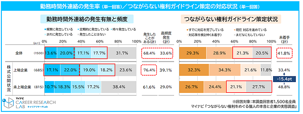 また、「つながらない権利」に関するガイドライン策定の対応状況を聞くと、「未着手」「まだなにもしていない」が合わせて41.8%にのぼった。同社では、すべてを一律に禁止するのは難しいものの、適切なタイミングや手段で連絡できるようなルール整備が求められていると指摘する。