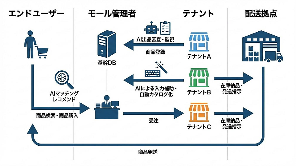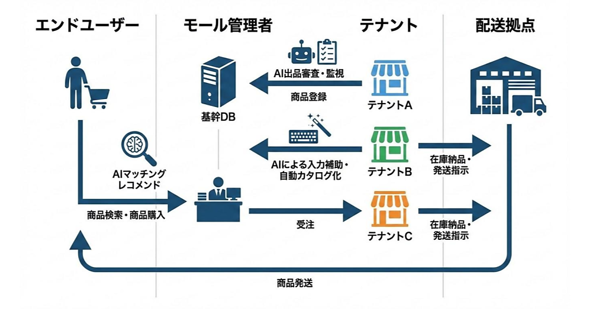 これまでのショッピングモール構築の枠を広げ、BtoB(企業間取引)の受発注、複数ブランドの会員統合、施設内サービスのデジタル化など複雑になる事業モデルをマーケットプレイス(経済圏)として再定義。サービス名をMall(商業施設)から広義な取引基盤を示すMarketplace(市場)に改めた。企業のさまざまな商流をAI活用とDXコンサルティングを組み合わることで収益を生むプラットフォームにする。