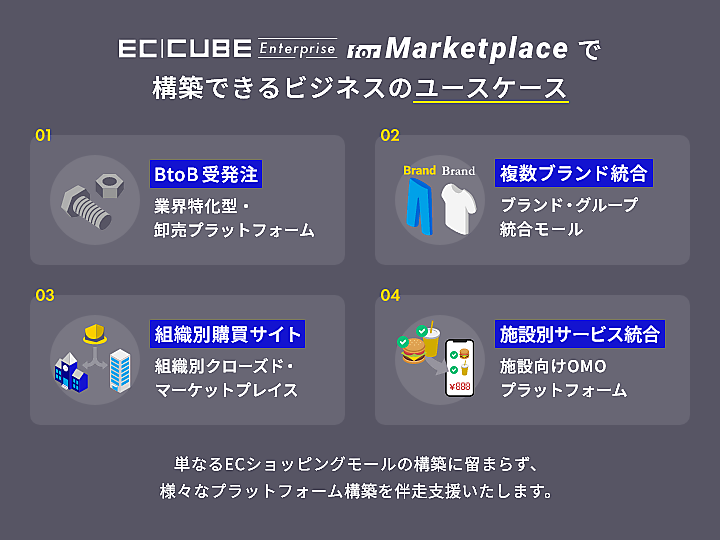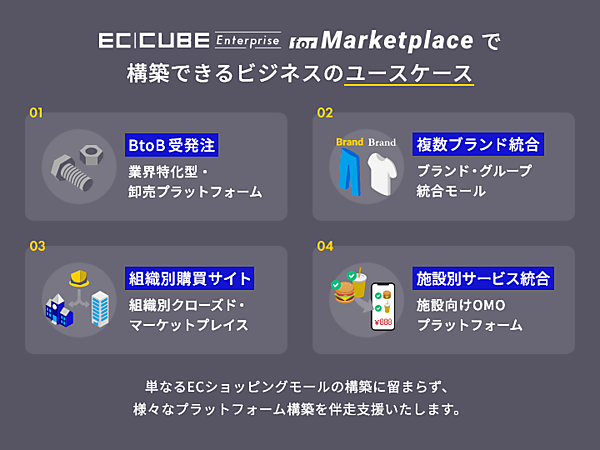 マーケティング・コマースAI(人工知能)事業のイルグルムの子会社でECプラットフォーム事業のイーシーキューブは、同社の大規模ECモール構築・運用サービス「EC-CUBE Enterprise Mall」を刷新し、「EC-CUBE Enterprise for Marketplace」の名で展開する、と2月20日発表した。システム基盤の提供に加え、AIの活用提案とDX(デジタル変革)コンサルティングを統合したトータルソルーションとなる。