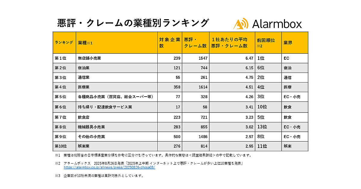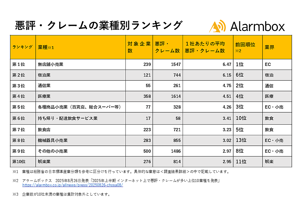 アラームボックスは、「2025年下半期 インターネット上で悪評・クレームが多い上位10業種」を発表した。10,778社の企業を対象に、2025年下期(7月~12月)にインターネット上で投稿されたクチコミや評判を集計している。