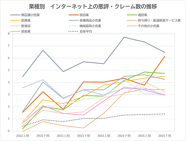 1位の無店舗小売業は、調査を開始した2022年上期から2025年下期まで、すべての時期において首位を記録。1社あたりの平均クレーム数は6.47件となっており、不満の内容としては、商品の品質や注文後の配送、問い合わせ対応などに関するものが目立った。