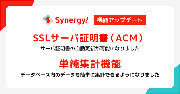 デジタルマーケティング支援のシナジーマーケティングは、同社のマーケティングSaaS「Synergy!」で、SSLサーバ証明書を自動更新する「SSLサーバ証明書(ACM)」と顧客理解を促進する「単純集計機能」の提供を始めたと2月24日に発表した。SSLサーバ証明書の運用自動化で煩雑な管理業務から解放し、マーケティング業務に使える時間を創出する。「独自ドメイン」オプション利用者が対象で、IT知識なしで常に最新のセキュリティレベルを保てる。