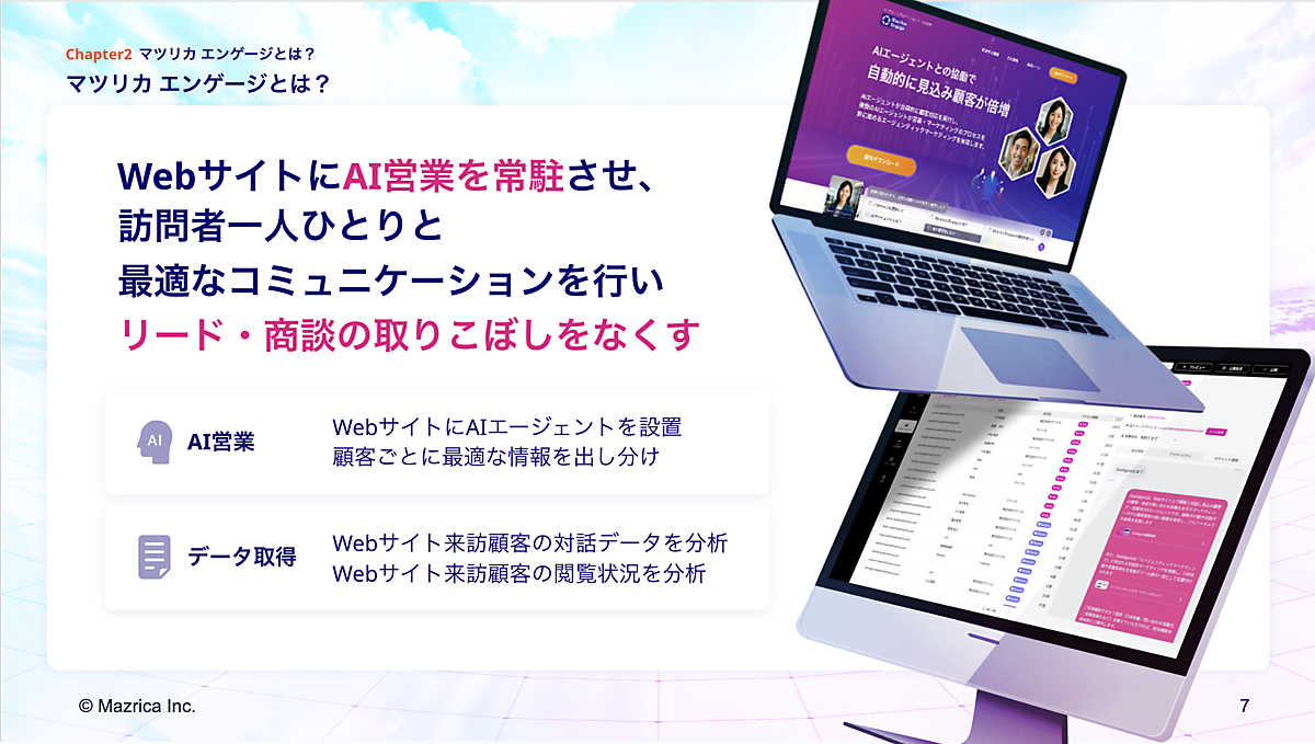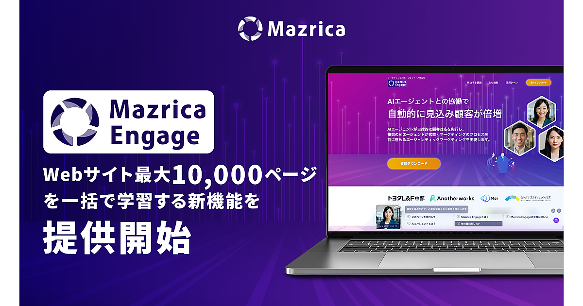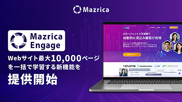 Mazrica Engageは2025年4月に提供を始めたサービスで、訪問者ごとにコンテンツを出し分けるパーソナライズ機能によって、WebサイトのCVR(顧客転換率)改善を訴求している 。新機能は複雑な階層構造の企業Webサイトにも対応しているので、企業はWebサイト全体の情報をAIエージェントに包括的に学習させることができ、顧客からの多様な問い合わせへの対応力の向上が期待できる。