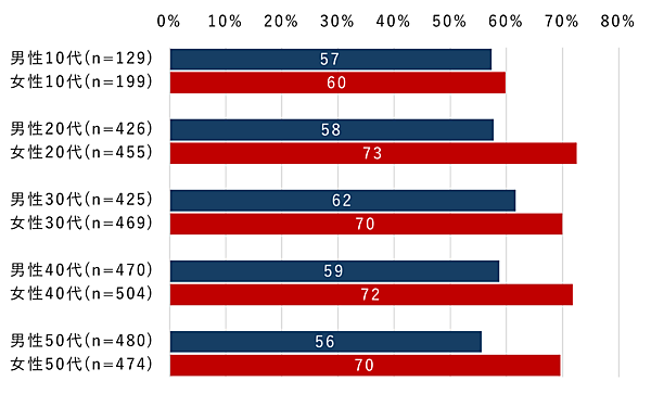 年代別に見ると、10代では他の年代と比べ情報疲労を感じる割合が低かった。加えて、男性では30代、女性では20代での割合が最も高かった。性別による差を見ると、全年代で女性の方が情報疲労を感じる割合が高く、女性の方がSNS上の情報の多さで疲れを感じやすい傾向が見られた。