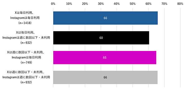 次に、SNSによる情報疲労を感じる割合を、X、Instagramの利用頻度別に分析した。