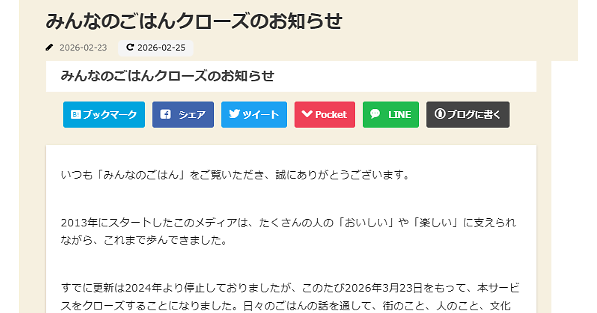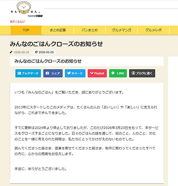 飲食店情報サイト「楽天ぐるなび」を運営する株式会社ぐるなびは、オウンドメディア『みんなのごはん』を2026年3月23日をもってクローズすることを発表した。