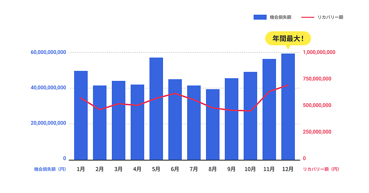 また、カゴ落ちによって発生した「機会損失額」は、実際の売上金額の約2.6倍に達した。特に商戦期の12月は機会損失額が大きく、「本来買われるはずだった金額」の取りこぼしが明らかになった。