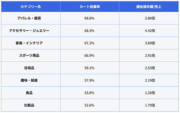 カゴ落ち率と機会損失倍率を業種別に見ると、「アパレル・雑貨」や「アクセサリー・ジュエリー」などのファッション系はカゴ落ち率が7割近くに達した。価格やデザインを他店と比較・検討する購買行動が背景にあると見られる。