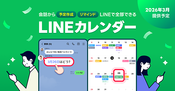 LINEヤフーは、コミュニケーションアプリ「LINE」上で予定の作成から管理、リマインドまで行える「LINEカレンダー」機能の提供を3月に開始すると2月26日に発表した。トークルームとカレンダーが分断されていることで、予定の作成・確認に手間が生じているという課題に対応した。LINE上での会話から自然に予定を作成・共有・管理できる新たなカレンダー体験を提供する。