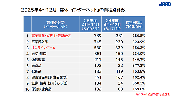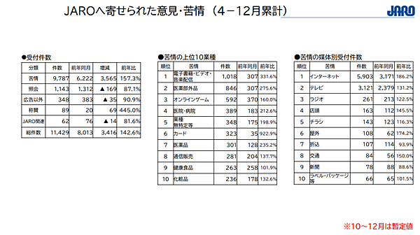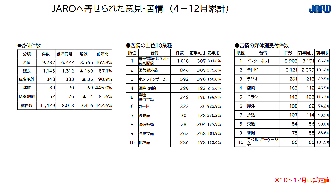 日本広告審査機構(JARO)は、2025年4月~12月に寄せられた広告に関する苦情・意見の件数を集計した。特に、インターネット上の性的な広告の苦情受付状況についてまとめている。
