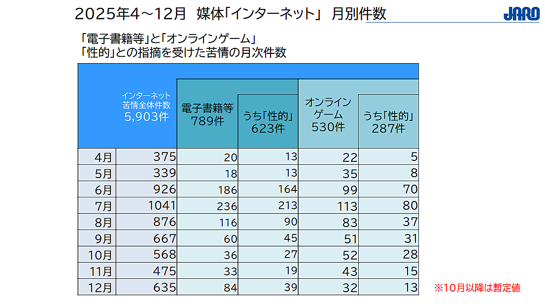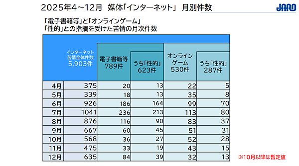 さらに、インターネット分野のうち「電子書籍等」と「オンラインゲーム」では、「性的」との指摘を受けた苦情が多数を占めていることが明らかになった。電子書籍等では789件中623件、オンラインゲームでは530件中287件が「性的」と指摘されている。月別に見ると、特に6~8月の夏季に苦情が集中していた。