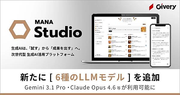 生成AI(人工知能)の法人活用支援やマーケティングDX(デジタル変革)事業を手掛けるギブリーは、同社が展開する生成AI・AIエージェント活用プラットフォーム「MANA Studio(マナスタジオ)」をアップデートし、最新のLLM(大規模言語モデル)に対応させた、と3月3日発表した。従来のLLMは自動で置き換わる。
