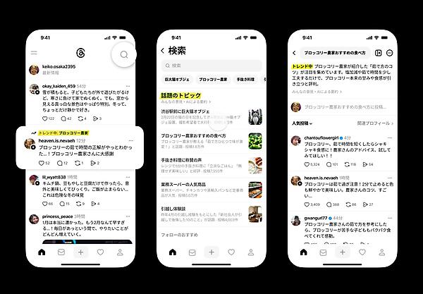 話題のトピックは日本で2024年10月に「トレンドランキング」機能としてテストを始め、名称を話題のトピックに変えた。アプリ右上の虫眼鏡アイコンをタップすると表示される検索画面で確認できる。日本のユーザー全体の中でトレンドになっているトピックを機械学習AIシステムで5つ選んで示している。