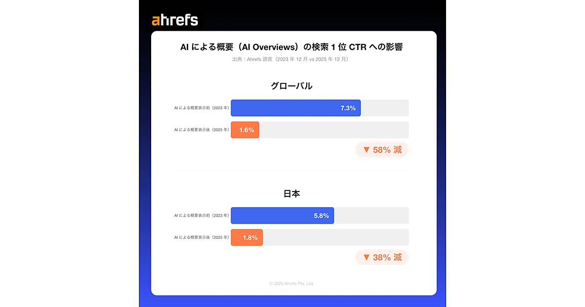 Ahrefs(エイチレフス)は、Google の「AI による概要(AI Overviews)」がCTR(クリック率)に与える影響を分析した。日本市場とグローバル市場の情報収集型キーワード30万件を対象に調査している。