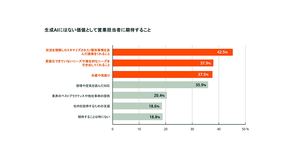 しかし、依然として多くの買い手は「営業担当だからこその価値」を求めている。生成AIにはない価値として期待していることを聞くと、「状況を理解し、個別事情を踏まえた提案」「言語化できていない潜在ニーズの引き出し」「共感や気配り」といった、人ならではの柔軟な対応が上位となった。
