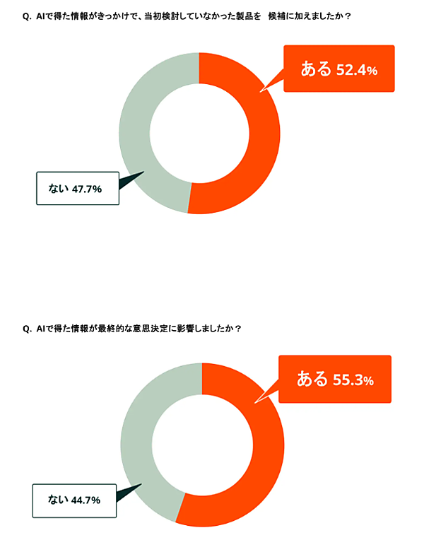また、「生成AIの活用によって当初検討していなかった製品を候補に加えたことがあるか」という質問では、52.4%が「ある」と回答。さらに、「生成AIで得た情報が最終的な意思決定に影響したことがある」人は55.3%に達した。