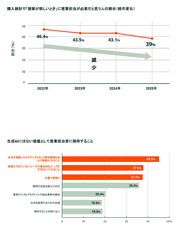 一方で、購入検討段階で「提案が欲しいとき」に営業担当者を必要とする割合は、2022年の46.4%から2025年の39.0%へと減少傾向にある。一般的なBtoB営業は、生成AIや検索に置き換えられつつあることがうかがえる。