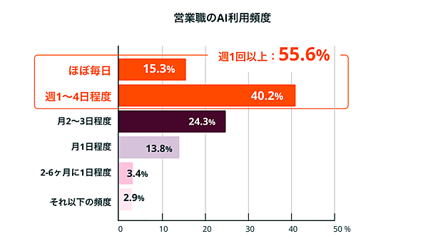 続いて、売り手である営業職の生成AI活用率を2024年と2025年で比較すると、1年で28.9%から43.4%へと14.5ポイント増加していた。