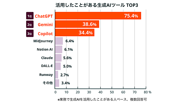 実務で活用している生成AIツールとしては、「ChatGPT」が75.4%と圧倒的に多く、「Gemini」(38.6%)、「Copilot」(34.4%)が同水準で続いた。また、有料版生成AIツールへの投資に対しては、「高いリターンがある」が合計で83.4%にのぼった。