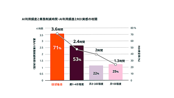 生成AIの利用頻度と成果実感の関係を見ると、利用頻度が高いほど「業務削減時間」と「ROI(投資利益率)の実感率」が高くなる傾向が見られた。「ほぼ毎日利用」と答えた人では、週平均3.6時間を削減し、ROI実感率は71.0%にのぼっている。
