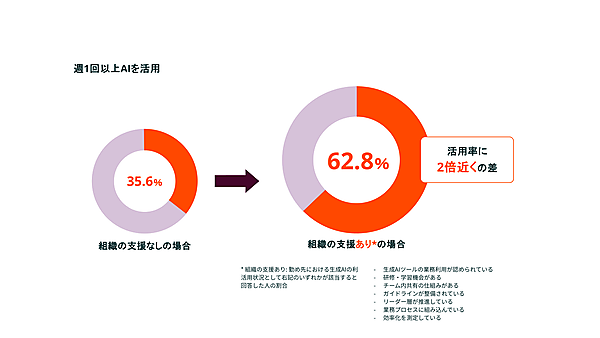 さらに、生成AIの活用について「組織からの支援がある」と答えた人では「週1回以上活用する」の割合が62.8%にのぼった。一方、支援がない場合には35.6%にとどまり、2倍近い差が見られた。