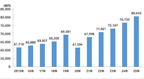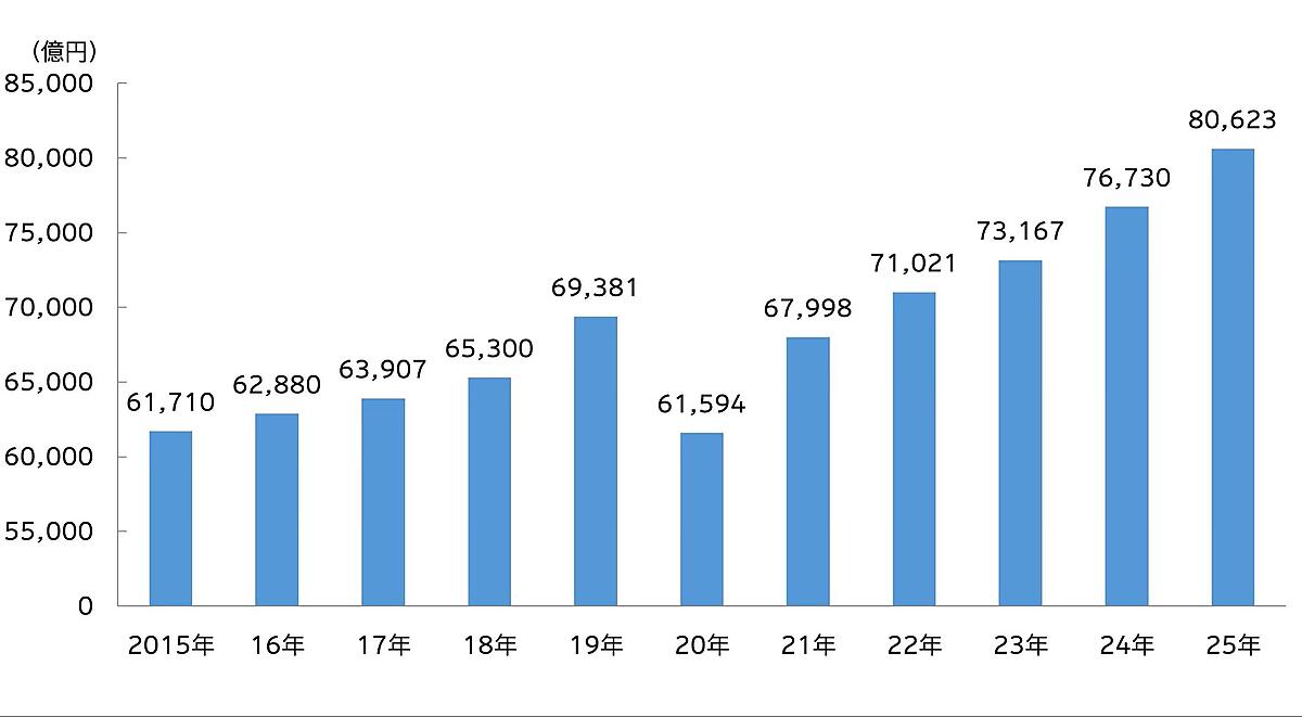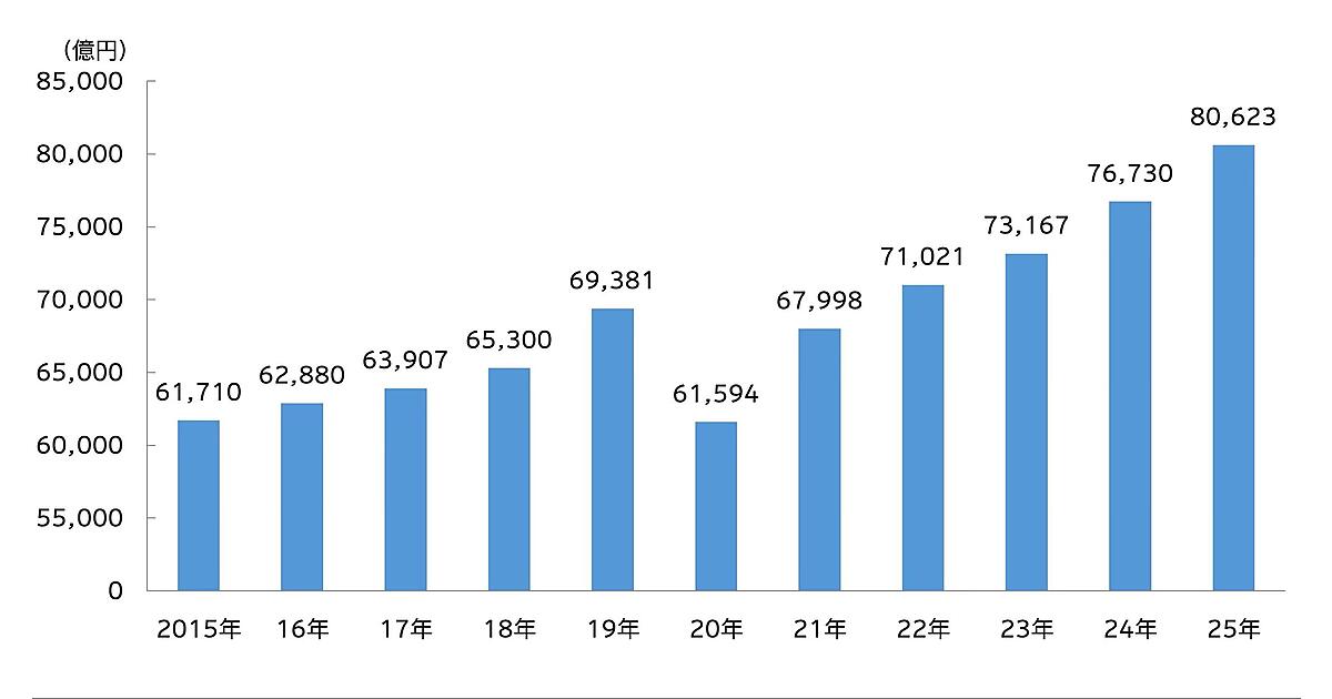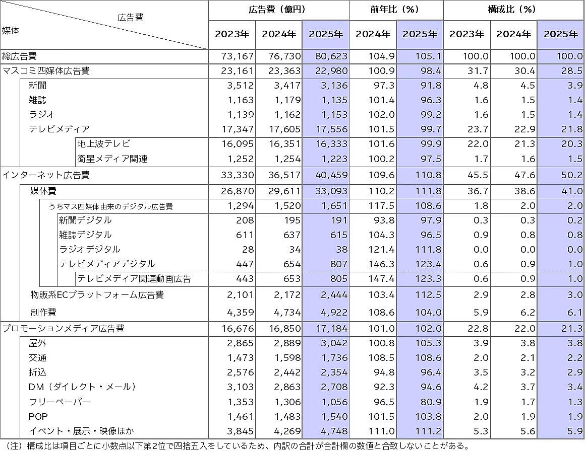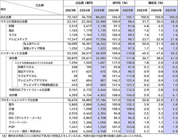 電通は、2025年の日本の総広告費と、媒体別・業種別広告費の推定「2025年 日本の広告費」を3月5日発表した。通年の総広告費は8兆623億円で、前年比105.1%と5年連続で増え、4年連続で過去最高を更新した。インターネット広告費が総広告費に占める構成比は50.2%にのぼり、初めて過半数になった。総広告費は広告媒体料と広告制作費を合わせた数値。