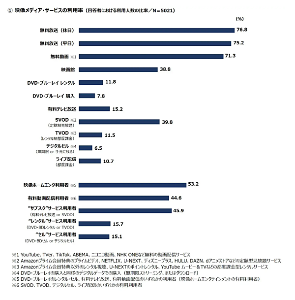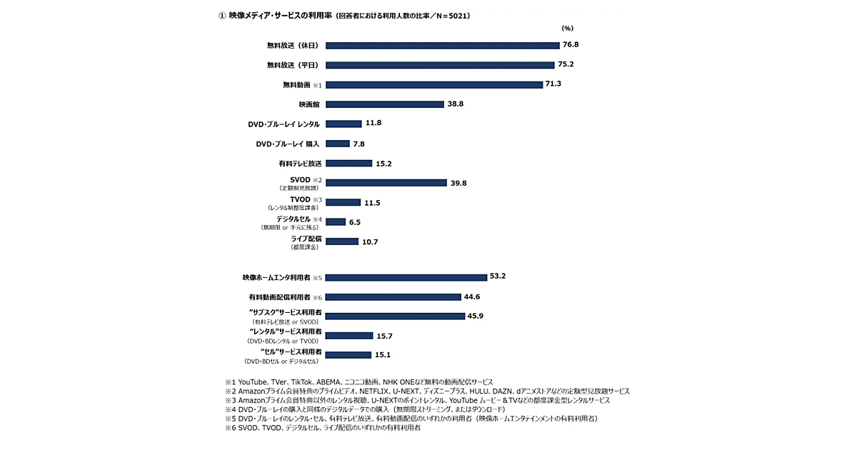 有料の動画配信では、プライムビデオ、NETFLIX、U-NEXTなどを含む「SVOD(定額制見放題)」が39.8%にのぼり、「映画館」(38.8%)を上回った。また、DVD・ブルーレイのレンタルや購入、有料テレビ放送、有料動画配信のいずれかを利用している人(映像ホームエンタ利用者)は53.2%となり、9年ぶりに半数を超えた。