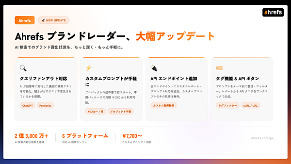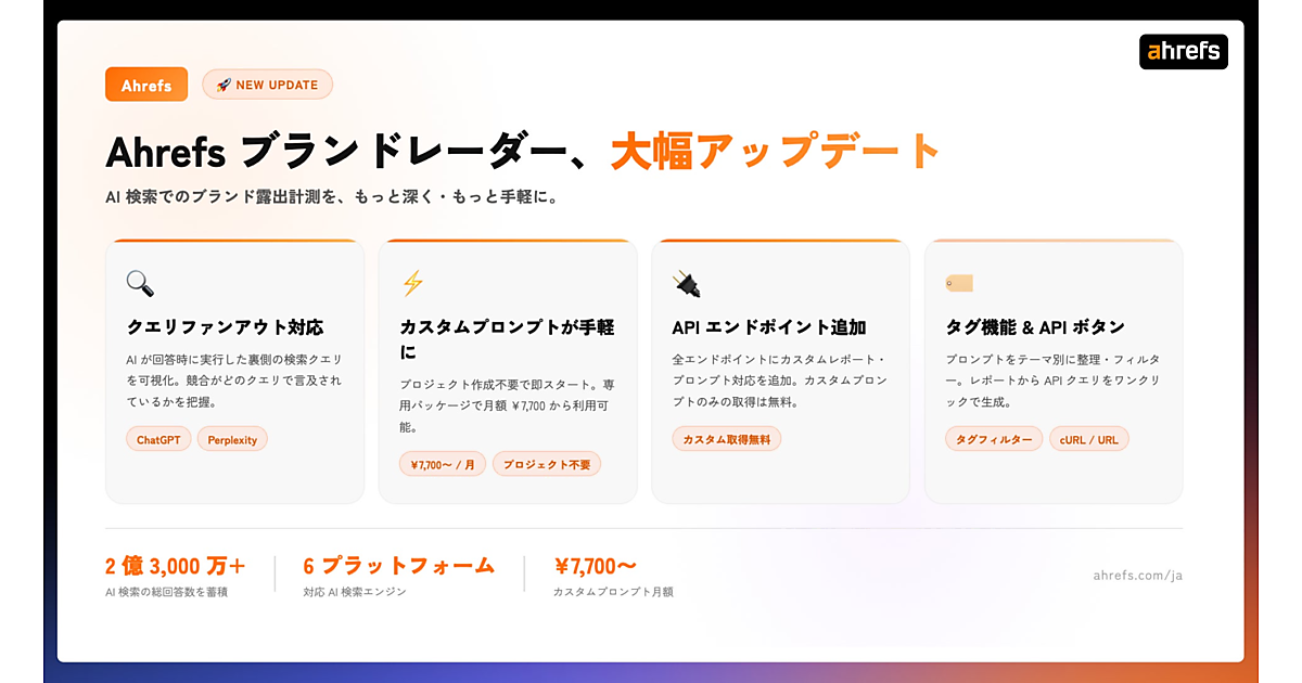 SEO(検索エンジン最適化)/LLMO(AI検索分析)ツールを提供するシンガポール発Ahrefs(エイチレフス)は、AI検索における自社ブランド露出を計測・分析する「ブランドレーダー」で複数の機能をアップデートしたと3月9日に発表した。「ChatGPT」と「Perplexity」にクエリファンアウト機能を対応させ、カスタムプロンプト(指示文)の利用条件緩和と料金改定、APIへの対応を追加した。AI時代のブランド可視性をより深く・手軽に分析できる環境を整えた。