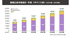 スマートフォン向け動画広告は昨年対比122.7%の7053億円にのぼり、動画広告需要全体の80%を占めている。また、コネクテッドテレビ向け動画広告も昨年対比127%となる1295億円だった。動画広告市場は今後も高い水準の成長を維持し、2026年に1兆437億円、2029年には1兆6336億円に達する見込みだ。