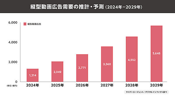 大手SNSや動画配信サイトによって、縦型動画広告の市場は急速な成長を見せている。2025年の縦型動画広告の市場規模は昨年対比155.9%の2049億円となり、スマートフォン向け動画広告全体の29.1%に達した。2029年には市場規模が5648億円となり、スマートフォン向け動画広告の42.5%を占めることが予測される。