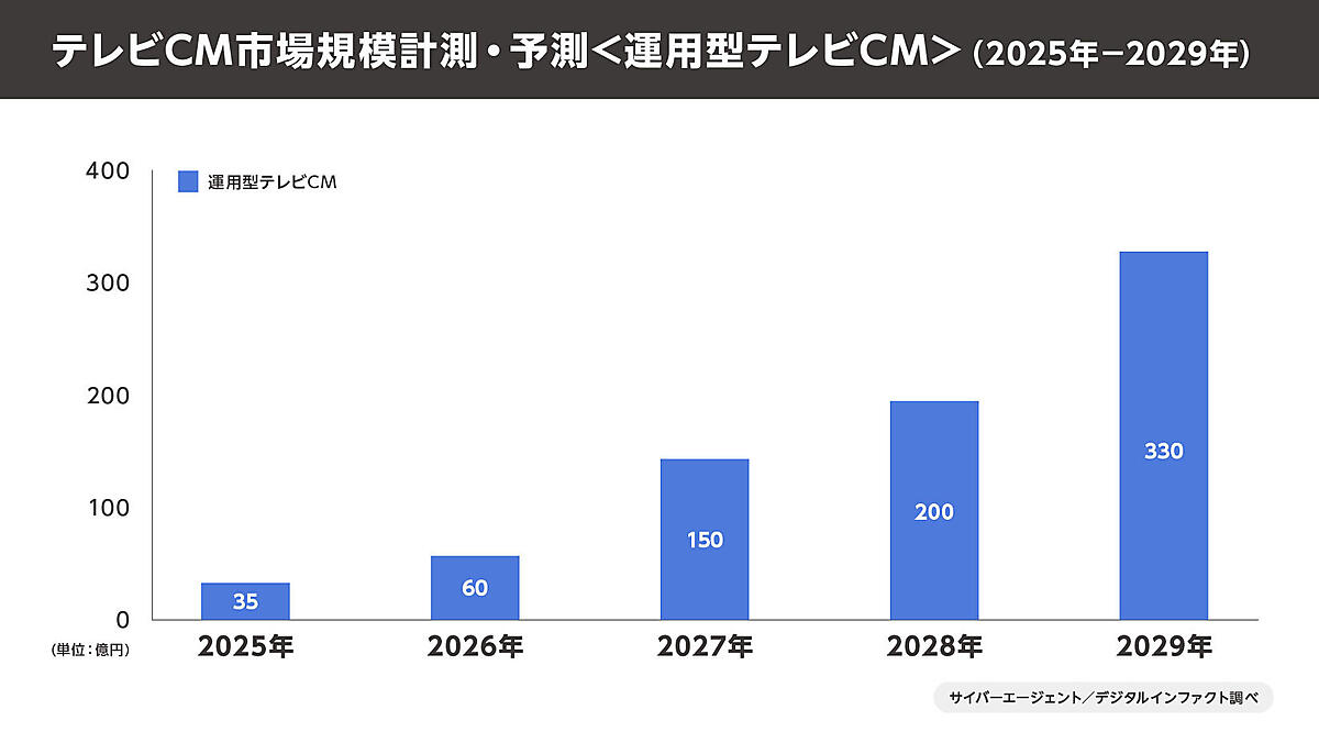 近年新たに登場したのが、デジタル広告と同様に少額から買付可能な運用型テレビCMだ。2025年時点の市場規模は35億円だが、2029年には330億円まで拡大する見込みだ。