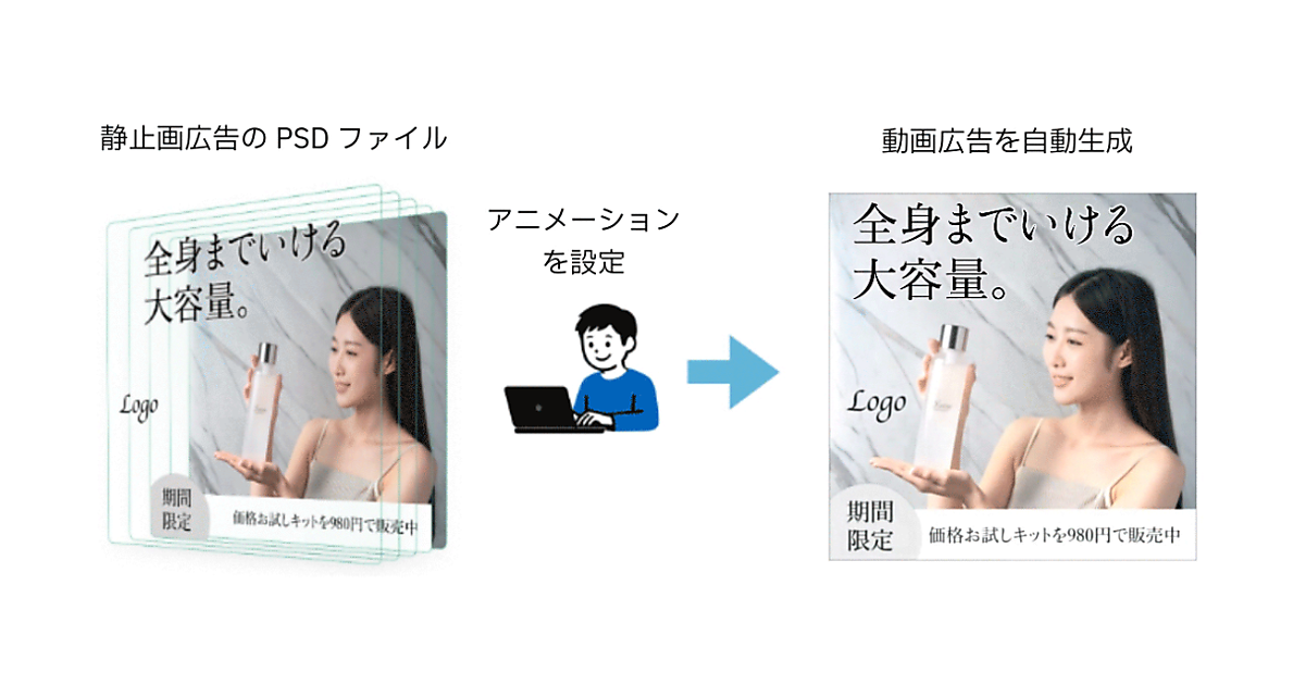 PSDファイルをアップロードしてアニメーションパターンを選択するだけで動画を自動生成するので、動画編集ソフトによる作業が不要になる。デザイナーやモーションデザイナーの専門リソースに頼らず、低コストで豊富なバリエーションの動画を制作してABテストやクリエイティブ検証を効率的にできる。商品画像やロゴなどのブランド素材はPSDのレイヤー構造を活用して忠実にアニメーション化するので、ブランドイメージを損なわずに動画化できる。