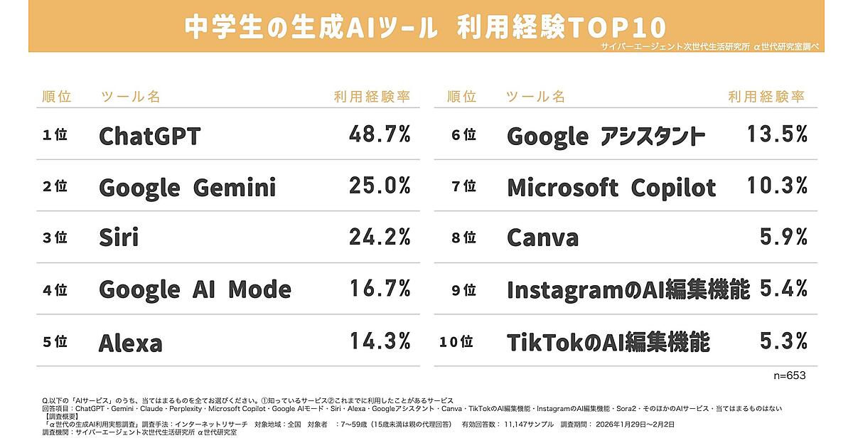 サイバーエージェントの「サイバーエージェント次世代生活研究所」は、「α世代の生成AI利用実態調査」を実施した。α世代(現在の中学生から高校1年生までを含む16歳以下の若者)を対象に、主要な生成AIツールの利用率などを調べている。