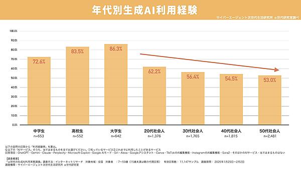 世代別で見ると、生成AIの利用経験率が最も高いのは大学生の86.3%で、ついで高校生の83.5%、中学生の72.6%と続いた。一方で、20代以降は年齢が上がるにつれて利用率が低下し、50代社会人は53.0%と最も低い水準となった。学生層との間には20~30ポイント以上の差が見られる。