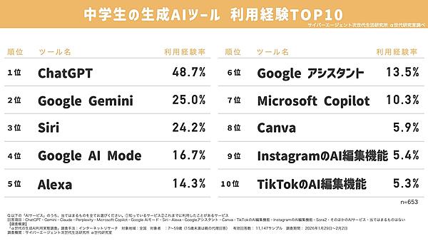 中学生が利用している生成AIツールを見ると、1位は「ChatGPT」で48.7%、2位は「Google Gemini」で25.0%となった。また「Siri」(24.2%)、「Alexa」(14.3%)、「Google アシスタント」(13.5%)など、ボイスアシスタント系ツールも上位に入った。